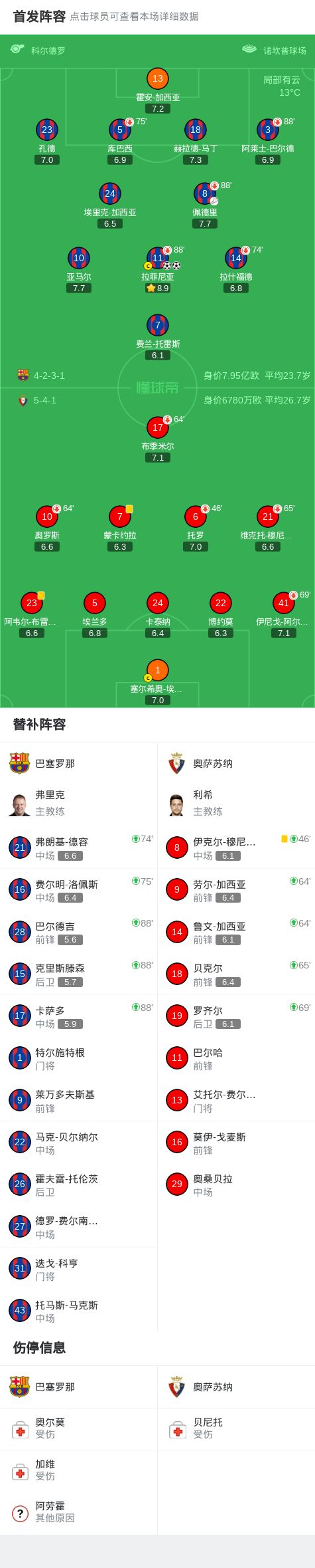 第75分钟,连换两人,德容和费尔明联袂登场
