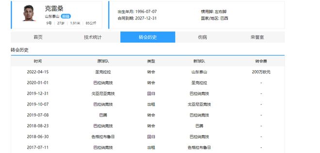克雷桑是山东泰山队外援,1996年出生,现今29岁,身高1米91,体重85公斤,在场司职前锋。