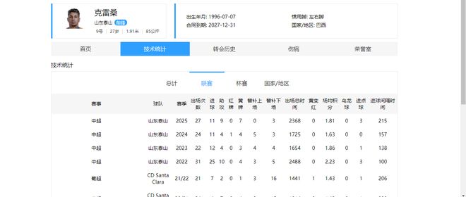 其一,克雷桑能力足够。他的首个中超赛季,就交出31场25球10助攻表现,后面的三个赛季,单赛季进球数也都成功上双(23赛季12球、24赛季11球、25赛季11球)。而且克雷桑在身体对抗这一块对东亚球员是比较有优势的,27年克雷桑31岁,即使是一个中锋的黄金生涯末期但是依旧强度高于国内球员。