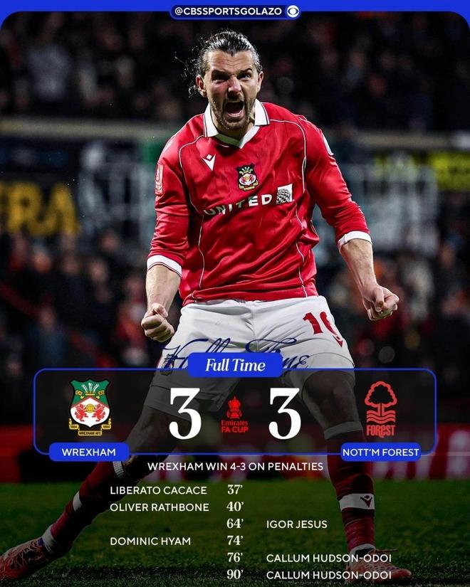 兄弟,北京时间1月10号的足总杯第3轮爆出超级大冷门!英冠球队雷克瑟姆在主场居然淘汰了英超劲旅诺丁汉森林,全程看得我目瞪口呆!120分钟3-3战平,最后点球大战4-3取胜,总比分7-6昂首晋级,这就是足总杯的魅力啊,永远不缺“以下克上”的童话!我跟你细说这场球的剧情,简直比电影还精彩。雷克瑟姆在主场踢了个完美的上半场,完全没把英超的诺丁汉森林放在眼里。先是卡卡切进球,接着拉斯伯恩再下一城,直接带着2-0的领先优势进入中场休息。当时我就纳闷了,这还是我们认识的那个英冠球队吗?面对英超劲旅居然踢得这么从容,进攻防守都有模有样,主场球迷的气氛估计都炸了。