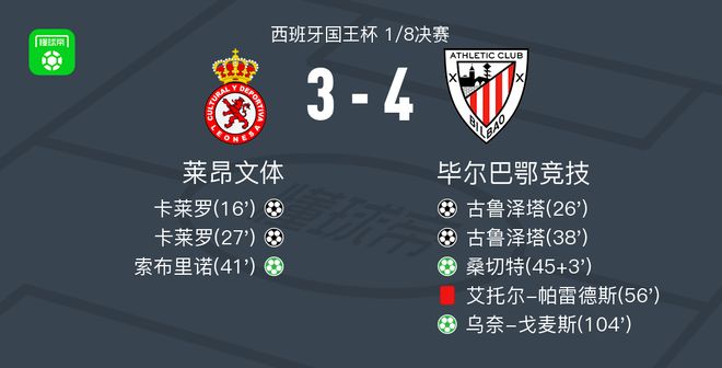 北京时间1月14日西甲日报西班牙国王杯 1/8决赛,莱昂文体对阵毕尔巴鄂竞技。莱昂文体卡莱罗梅开二度,索布里诺破门。毕尔巴鄂竞技古鲁泽塔梅开二度,桑切特破门,乌奈-戈麦斯破门。最终比分莱昂文体 3-4 毕尔巴鄂竞技。